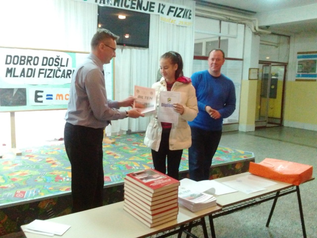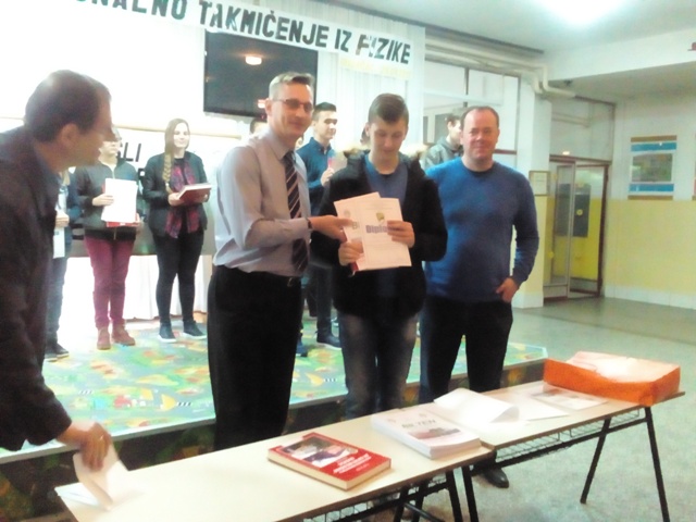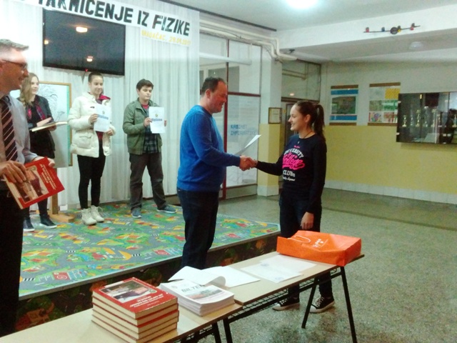 Direktor JU OŠ „Dr. Safvet-beg Bašagić“ je učenicima koji su osvojili prva tri mjesta, kao nagradu, uručio knjigu autora Esada Sarajlića „JAVNA USTANOVA OSNOVNA ŠKOLA „DR. SAFVET-BEG BAŠAGIĆ“, 125 GODINA ŠKOLE“. Predsjednik Društva fizičara TK, prof. Mirsudin Pačariz je, u ime Društva, prvoplasiranim učencima dodijelio i skromne novčane nagrade.