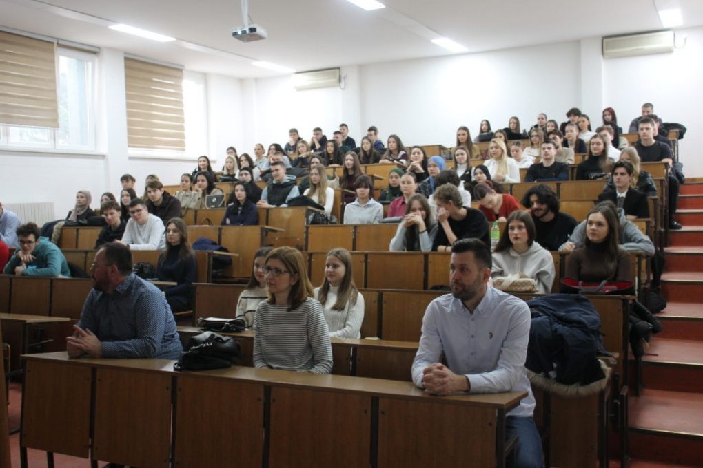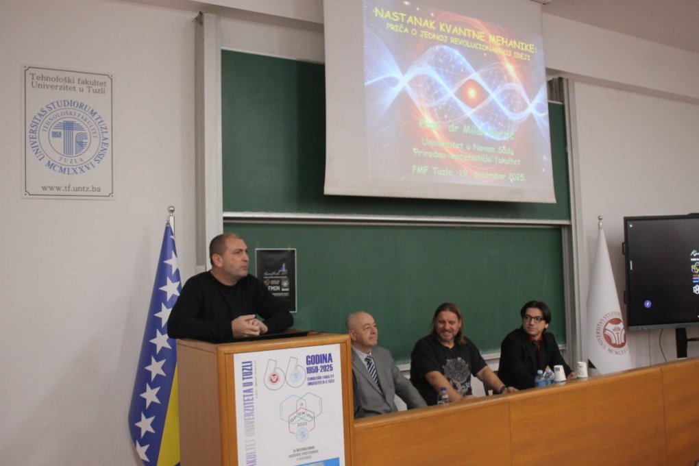 U petak, 19.10.2025. godine su u punom Amfiteatru Tehnološkog fakulteta održana predavanja prof. dr. Milana Pantića (Univerzitet u Novom Sadu) i dr. Saše Cecija (Institut Ruđer Bošković, Zagreb) za učenike srednjih škola. Predavanja o korijenima ideje kvantne mehanike, njenoj historiji i budućnosti, idejama i koncepatima kvantne teorije držala su pažnju prisutnih, radoznalih učenika i srednjoškolaca.